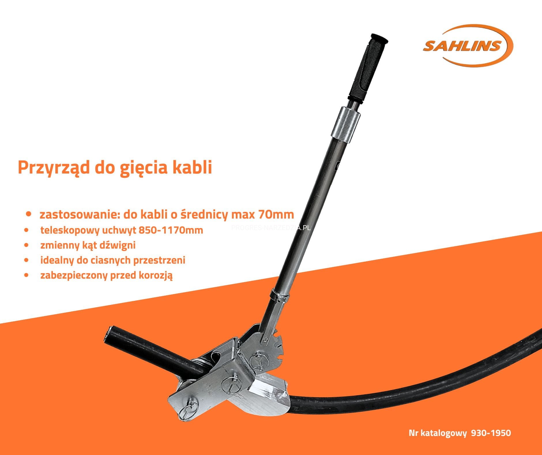 Dźwignia do gięcia kabli Sahlins 930-1950 to praktyczne narzędzie do pracy z kablami energetycznymi. Dzięki temu narzędziu można łatwo dogiąć kabel na pożądany promień, co usprawnia i skraca czas pracy. Giętarka została zaprojektowana do pracy w ciasnych przestrzeniach, dzięki czemu sprawdza się w różnych środowiskach pracy. Teleskopowy uchwyt można regulować w zakresie od 850 mm do 1170 mm i ustawić pod trzema różnymi kątami, co zapewnia elastyczność. Dźwignię można rozłożyć i umieścić w dowolnym miejscu wzdłuż kabla. Wykonana ze stali i w pełni ocynkowana, co zapewnia trwałość i odporność na korozję. Wyposażona jest również w gumowy uchwyt zapewniający bezpieczny i wygodny chwyt.