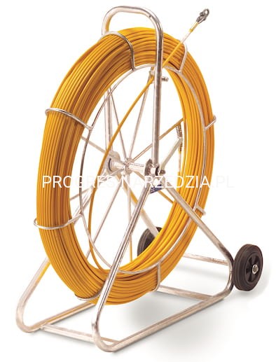 Włókno szklane Ø 11,0mm, na ocynkowanym stelażu z kołami, do rur o średnicy minimalnej 80mm, promień gięcia 400mm, średnica rdzenia 8,0mm. Do ciągnięcia i przepychania przewodów i kabli. Dostawa na ocynkowanym stelażu z hamulcem szpuli. Włókno zakończone aluminiową końcówka pilotującą z szelką.